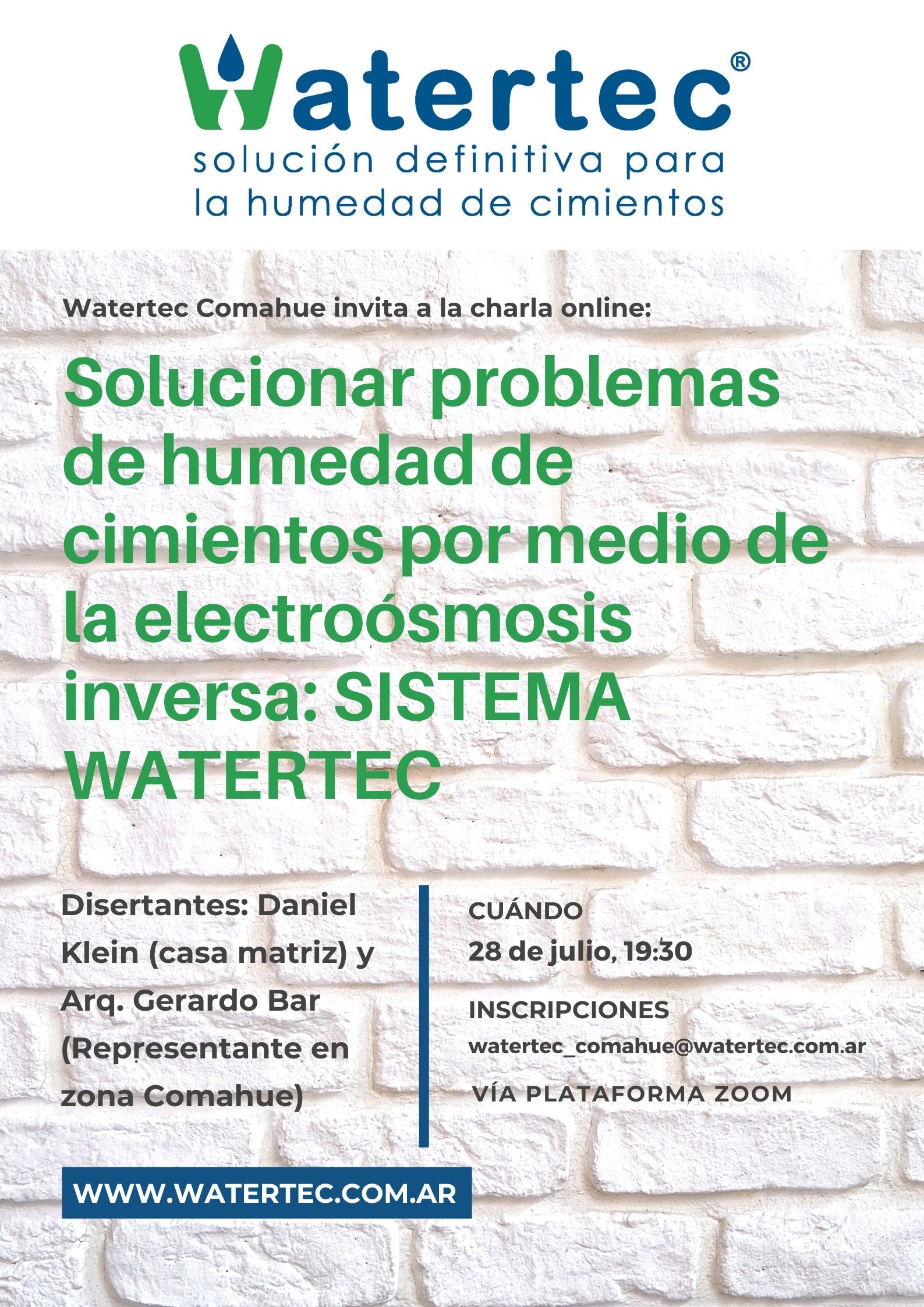 El equipo de Watertec Comahue tiene el agrado de invitarles a la charla “Solucionar problemas de humedad de cimientos por medio de la electrósmosis inversa: SISTEMA WATERTEC”, a cargo de Daniel Klein, de casa matriz, y el arquitecto Gerardo Bar, representante en la zona. La presentación será a través de la plataforma Zoom, el miércoles 28 de julio a las 19.30 h.