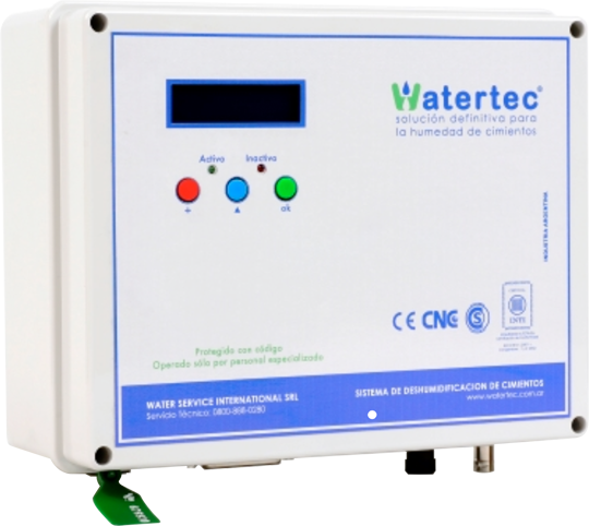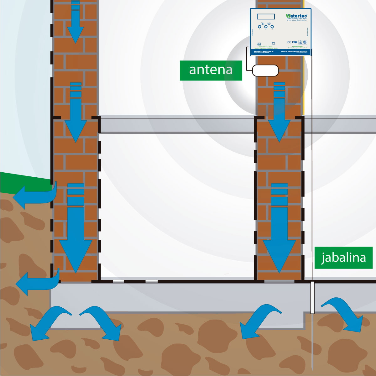 El Sistema Watertec ® es un equipo que, mediante la aplicación de un campo electromagnético, neutraliza la diferencia de potencial entre la mampostería y el terreno. Esta onda invierte la polaridad del agua contenida en los capilares, bloqueando la humedad ascendente y secando las paredes de forma definitiva. El radio de acción es esférico, deshumidificando todas las estructuras dentro del área de alcance, incluyendo paredes externas e internas, pisos, sótanos y fundaciones.